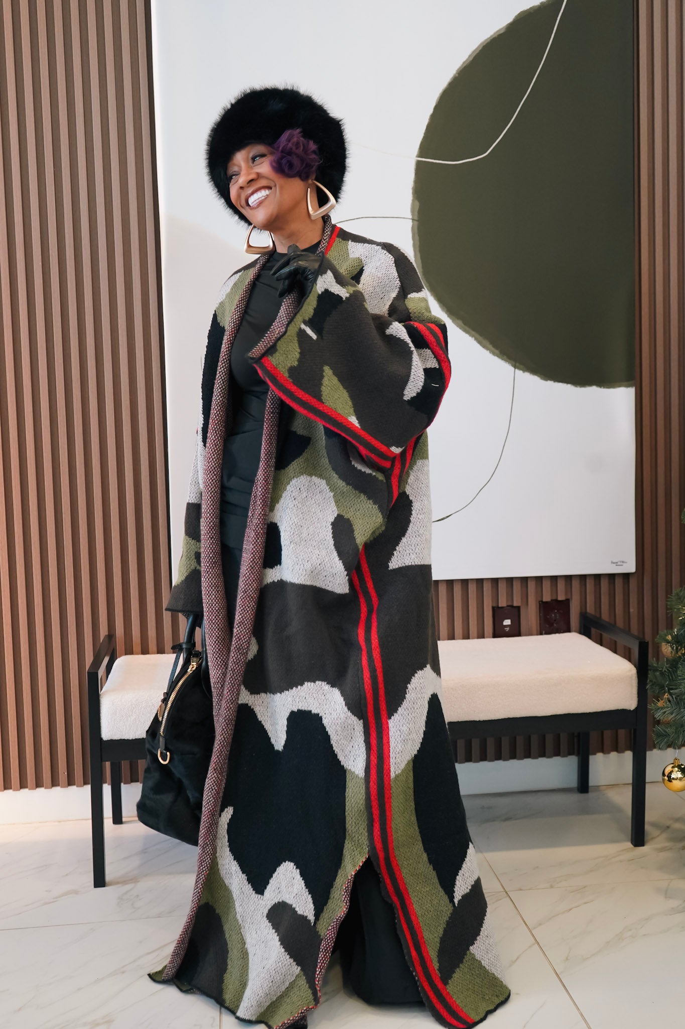 The duster is oversized & forgiving in fit highlighting shades of brown, green & black with an accent of red